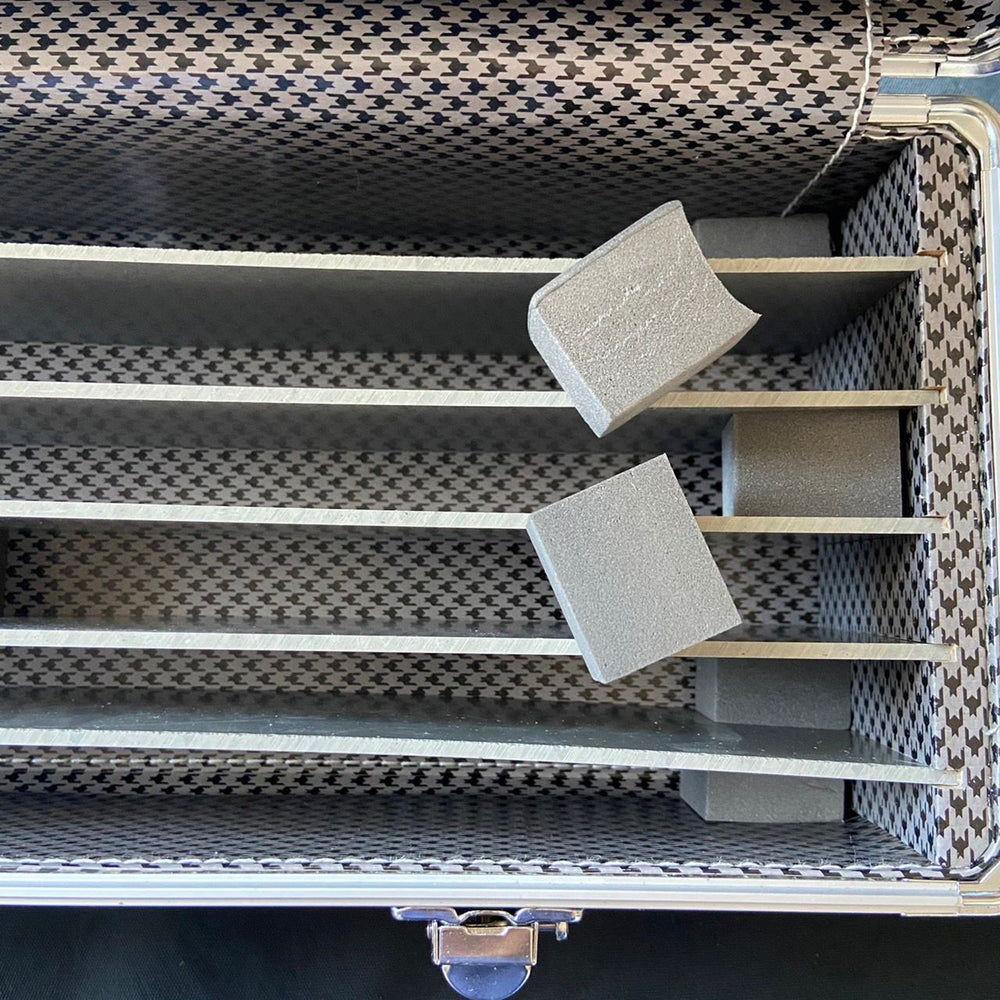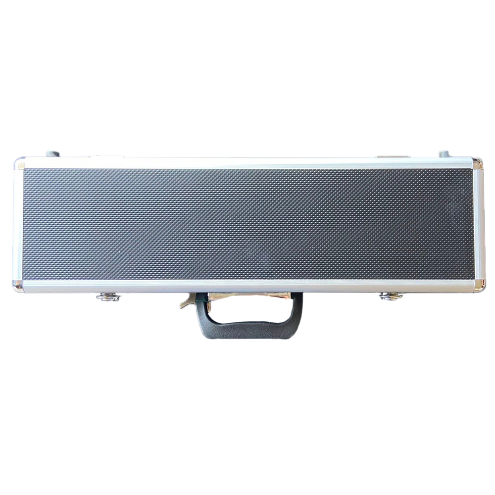 Esta maleta feito em couro sintético e acabamento em alumínio, possui 2 chaves, alça e possui 5 divisórias removíveis e mais 5 espumas de proteção.